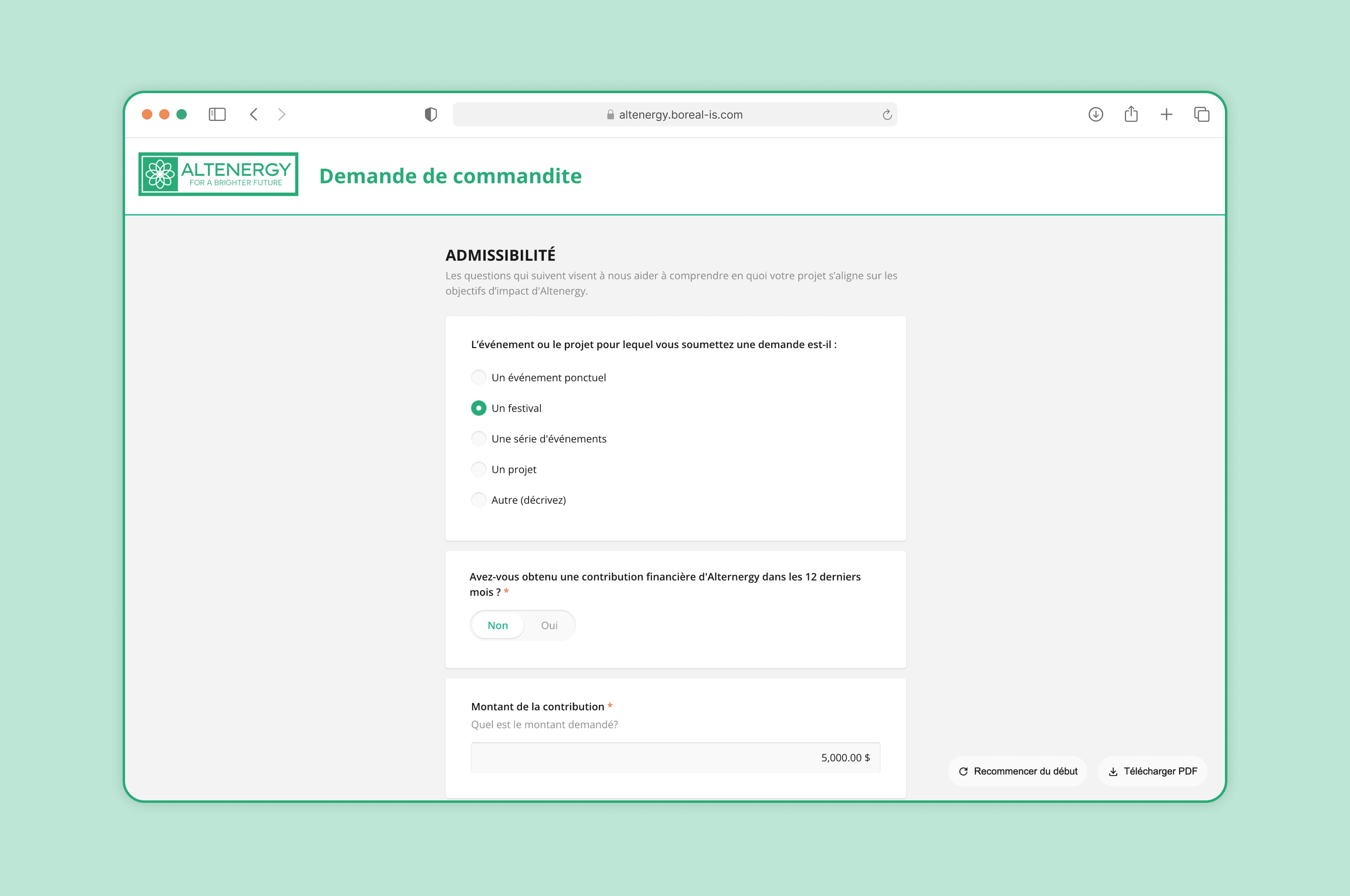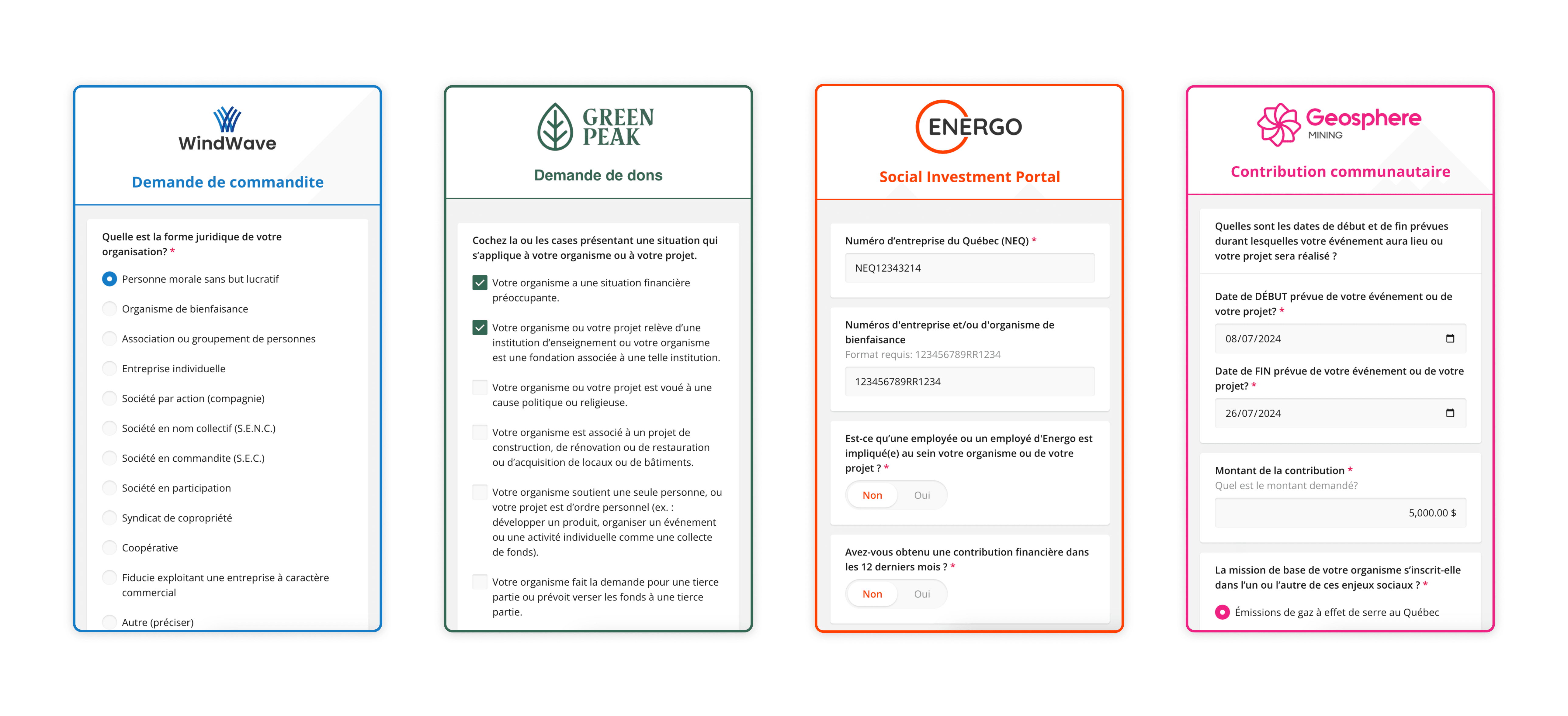 As part of our partnership with the Borealis team, we have developed a new social investment portal, enriching the experience of their customers. This portal enables organizations using the Borealis platform to collect donation and sponsorship requests through customizable questionnaires. Integrated directly into their stakeholder management system, this portal facilitates data centralization, request management and decision-making for organizations.
