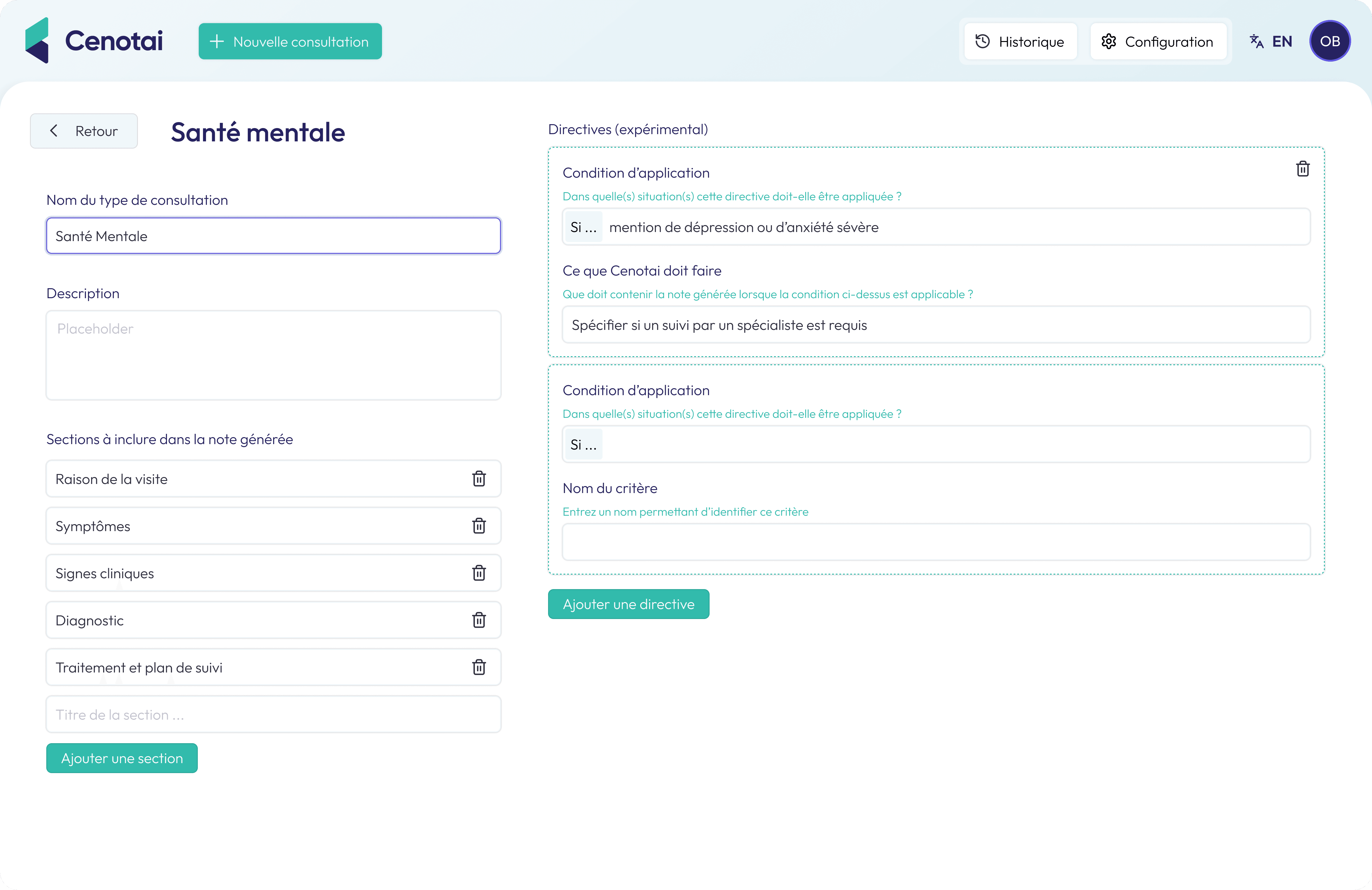 La solution permet également de personnaliser les modèles de notes afin de s’adapter aux différentes spécialités et pratiques médicales. Les utilisateurs peuvent définir des règles conditionnelles selon le type de consultation, ajuster les sections affichées et structurer le contenu selon leurs préférences. Le système vient avec une trentaine de réglages prédéfinis, prêts à l’emploi, tout en laissant une grande flexibilité pour affiner chaque détail au besoin.
