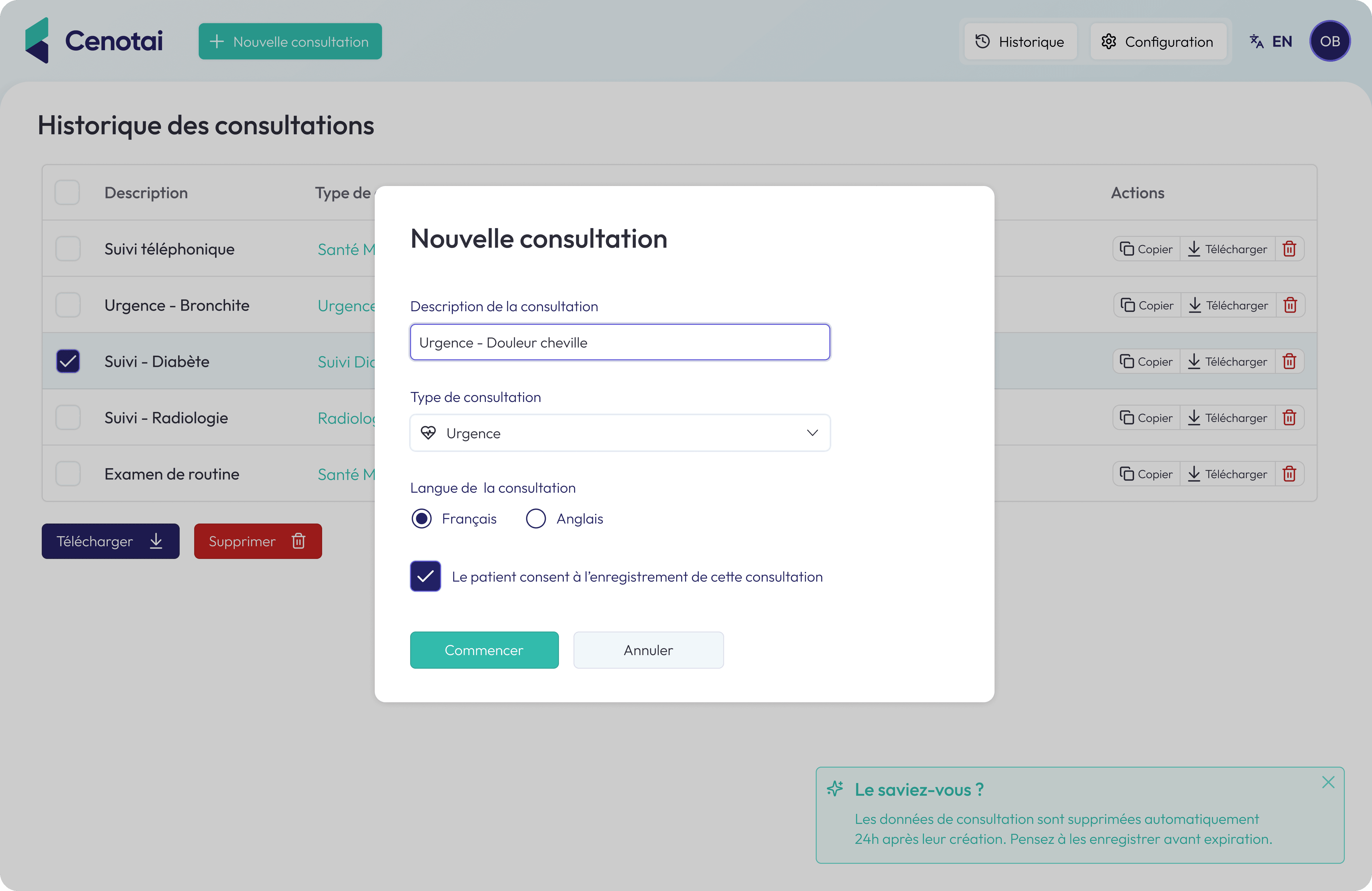 Cenotai est né d’un besoin concret : permettre aux médecins de gagner du temps en automatisant la transcription de leurs notes de consultation, tout en assurant un haut niveau de confidentialité et de conformité aux normes québécoises en matière de données de santé. Cela impliquait notamment l’anonymisation des données, la suppression automatisée des contenus confidentiels après usage, et une attention particulière à l’hébergement local.