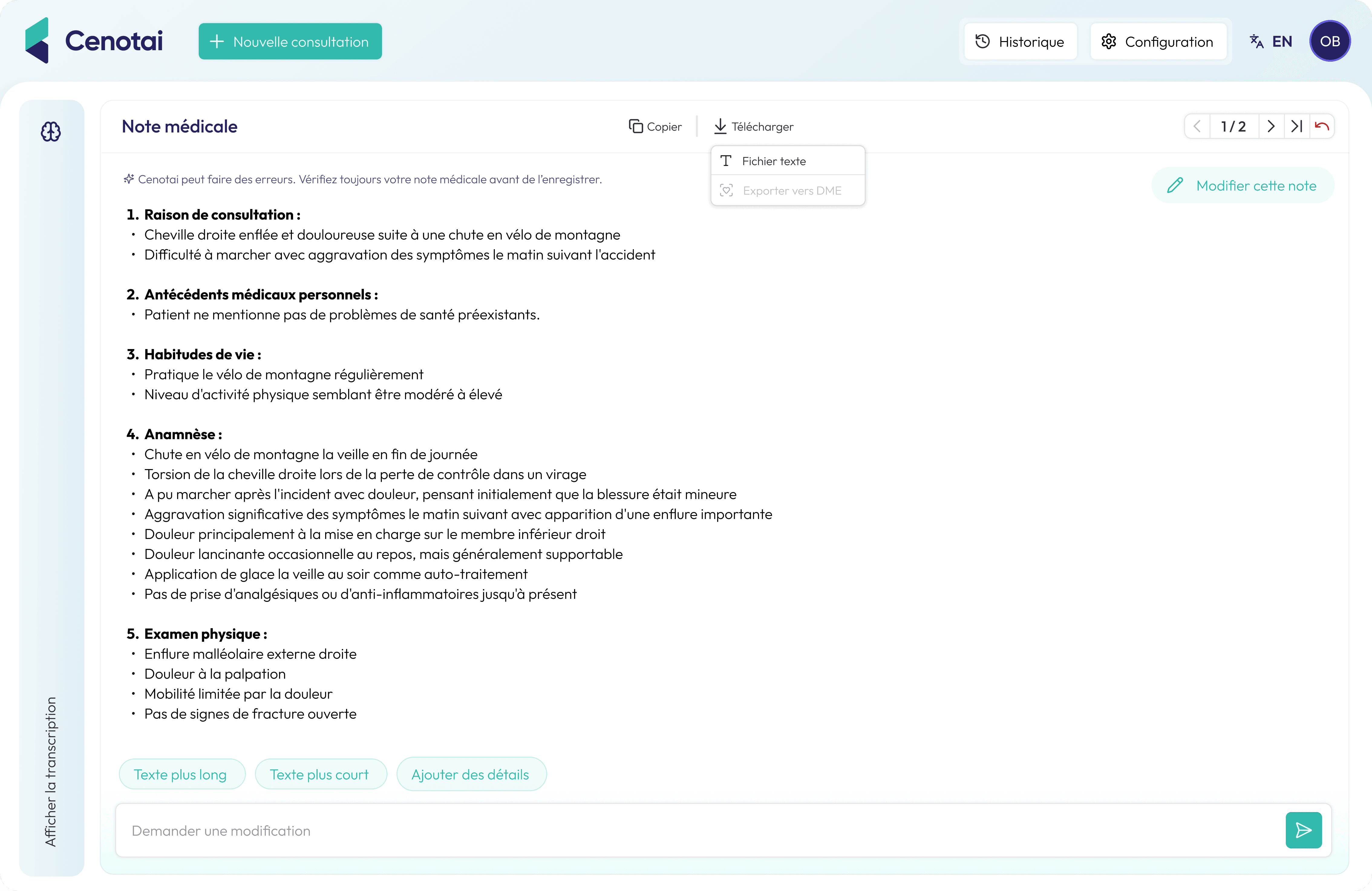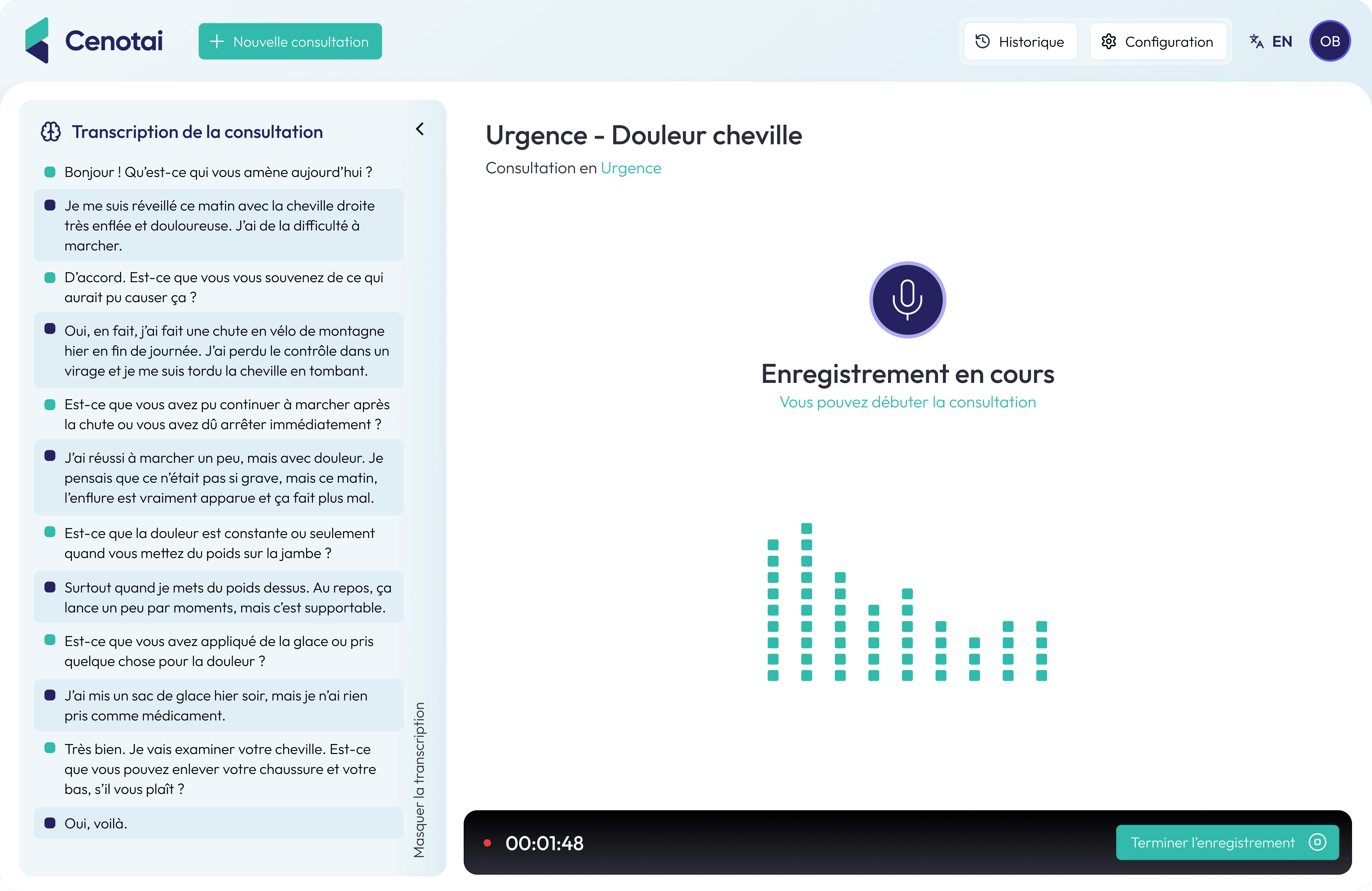 Pensée pour simplifier la prise de notes dans le domaine médical, Cenotai allie intelligence artificielle, sécurité et performance. Que vous soyez professionnel de la santé ou à la recherche d’une solution de transcription adaptable à votre secteur, découvrez comment cette technologie québécoise peut transformer votre quotidien.