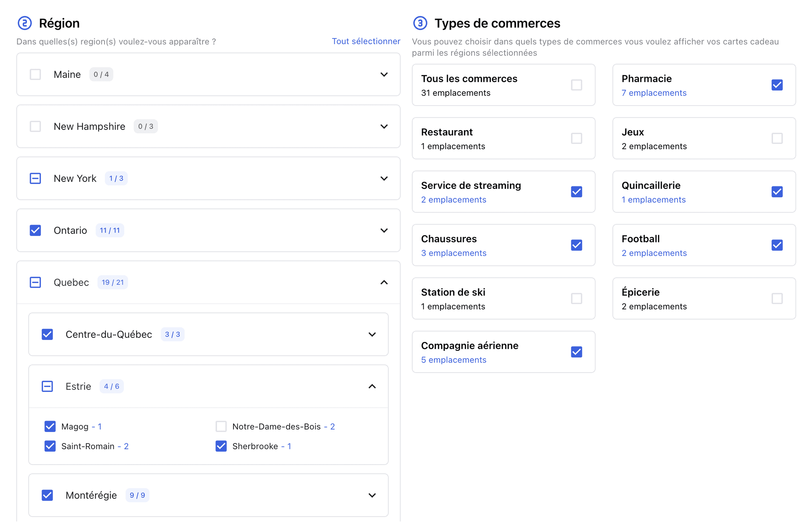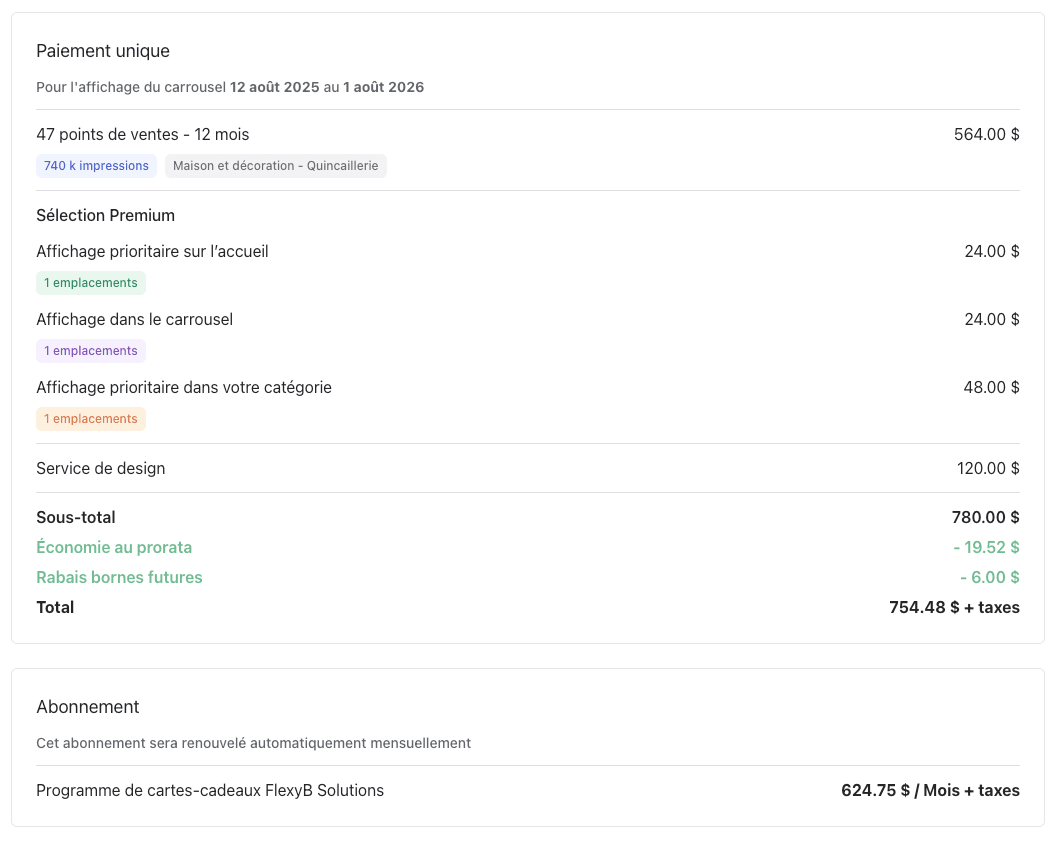 Créer une interface claire et intuitive permettant aux fournisseurs de planifier l’affichage de leurs cartes-cadeaux selon de multiples critères (type de commerce, région, durée, options premium), tout en intégrant un grand nombre de règles d’affaires complexes. L’objectif : offrir une expérience fluide autant pour les vendeurs que les fournisseurs, et ce, malgré la diversité des choix et des services proposés.