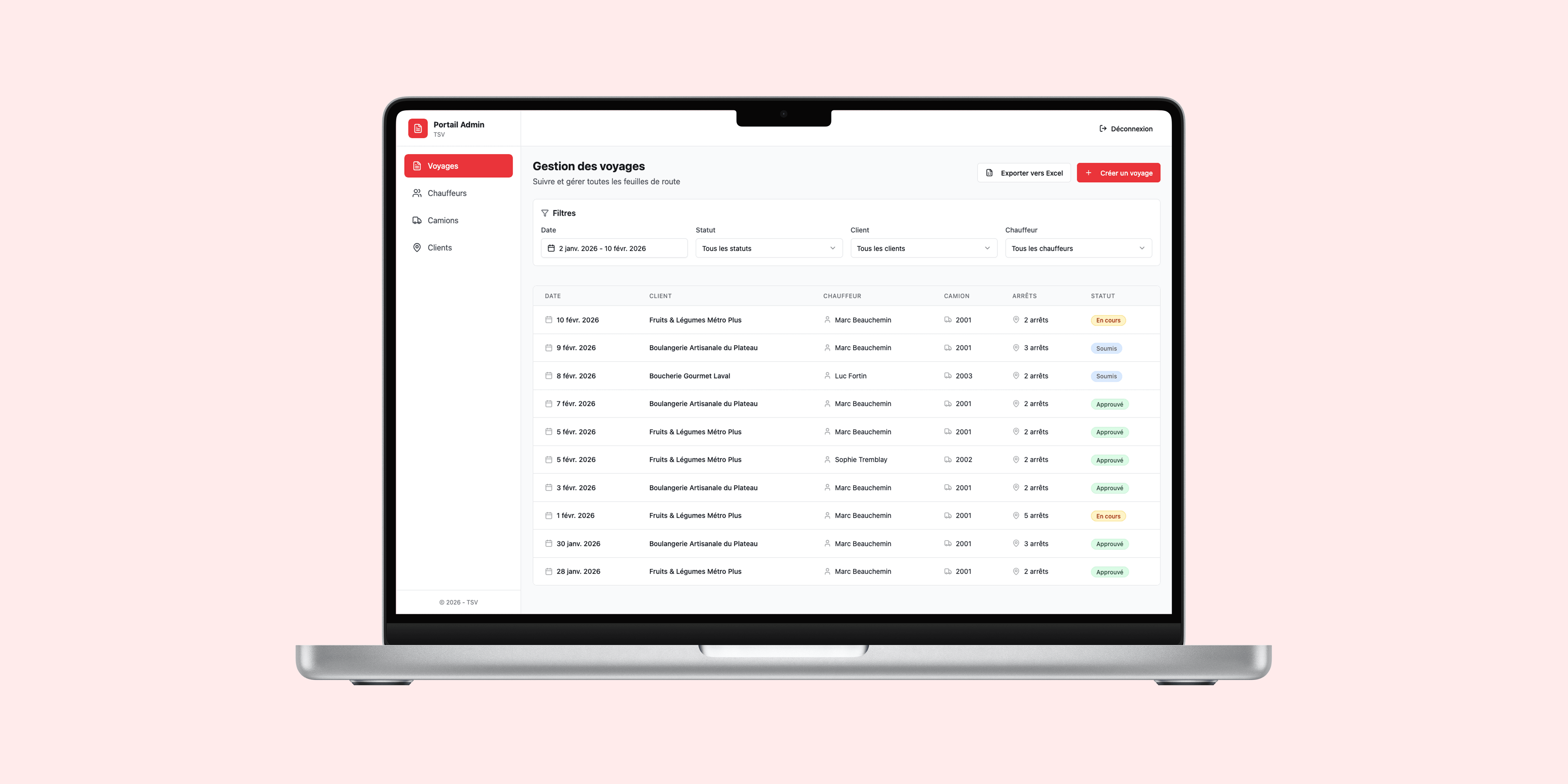 C'est la fonctionnalité phare pour l'administration. En un clic, le système génère des tableaux Excel standardisés et stylisés à partir des feuilles de route approuvées. Ce qui prenait des heures se fait désormais instantanément, prêt pour l'envoi au client.