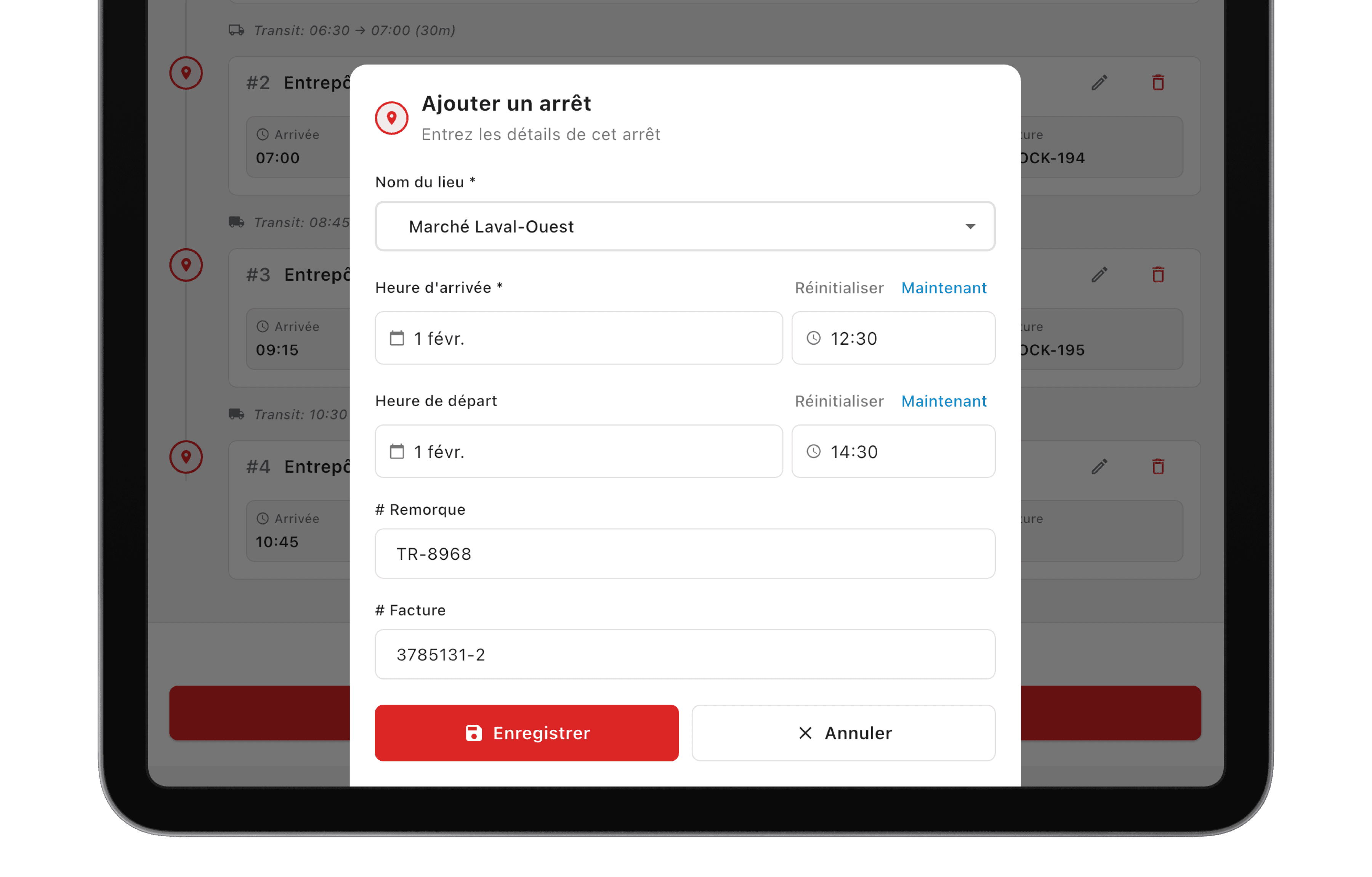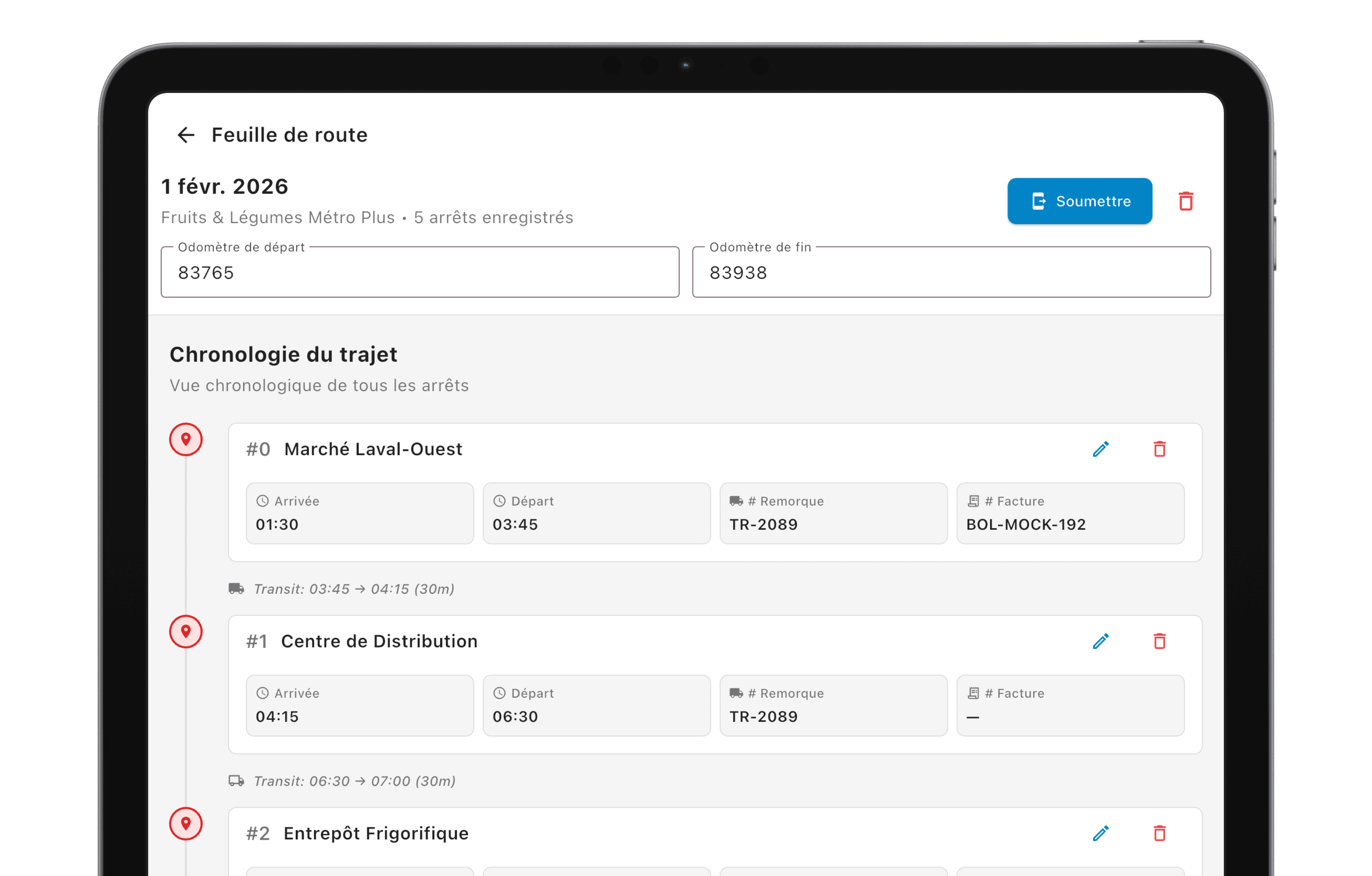 Fini les feuilles de route papier. Chaque chauffeur dispose désormais d'une application sur sa tablette conçue pour être utilisé sur le terrain. En quelques clics, ils peuvent créer et gérer leurs feuilles de route, documenter leurs arrêts et mettre à jour leurs statuts en temps réel. Une fois le trajet terminé, la soumission des rapports se fait instantanément, assurant une transmission immédiate des informations cruciales vers le bureau, sans aucun délai dû aux manipulations physiques.