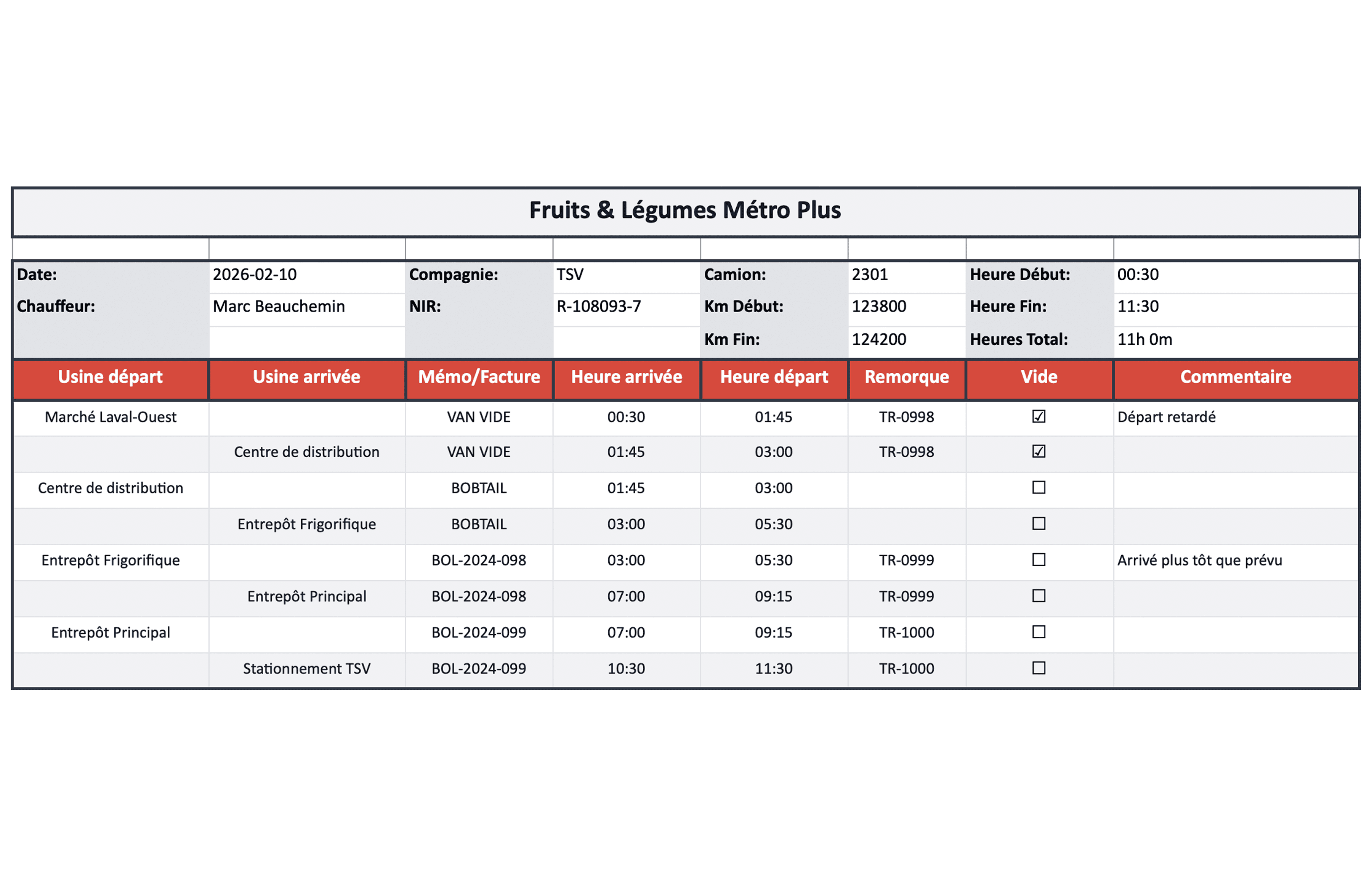 L'interface administrative transforme la vérification des feuilles de route en un processus fluide et visuel. Au lieu de déchiffrer des notes manuscrites, le gestionnaire révise des données claires et structurées envoyées en temps réel par les chauffeurs.